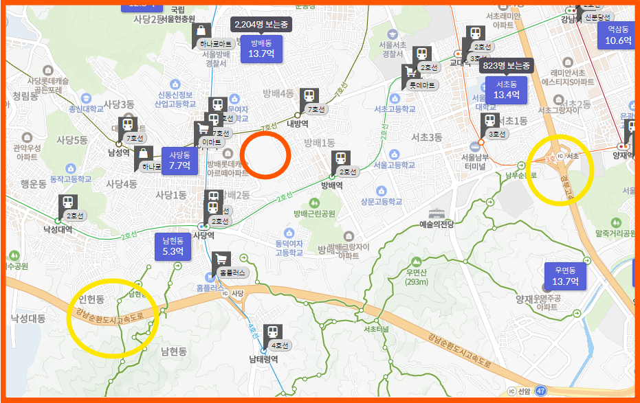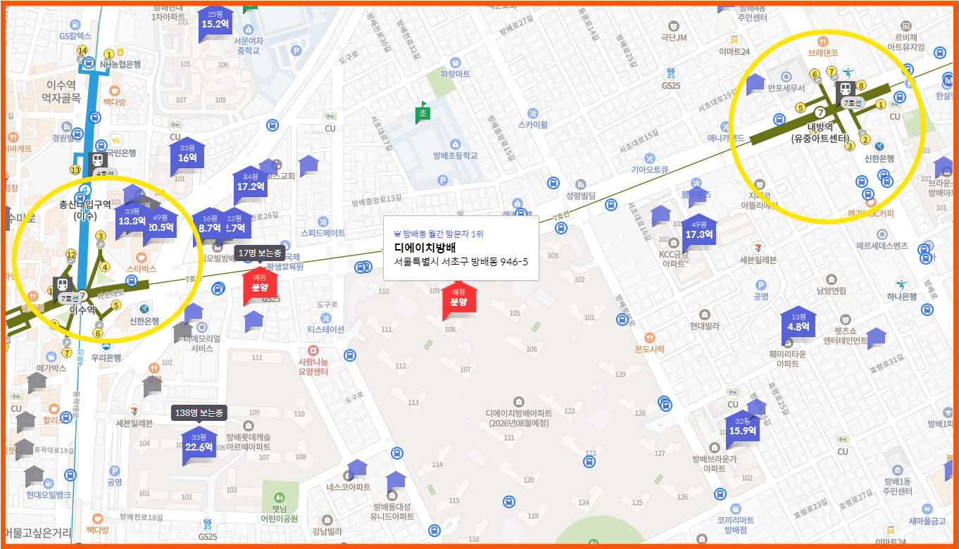 방배동 디에이치는 내방역과 이수역 사이에 위치해요. 정확히 역세권이라고 하긴 애매하지만, 양쪽 역까지 도보로 약 15분 정도 걸리니 교통이 완전히 불편한 건 아니에요.