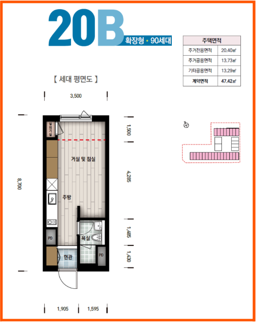 20B형은 20A형과 비슷하지만 길이가 조금 더 길고, 폭이 좁아 화장실이 작아요. 그 덕에(?) 생활공간은 더 넓게 사용할 수 있어요.