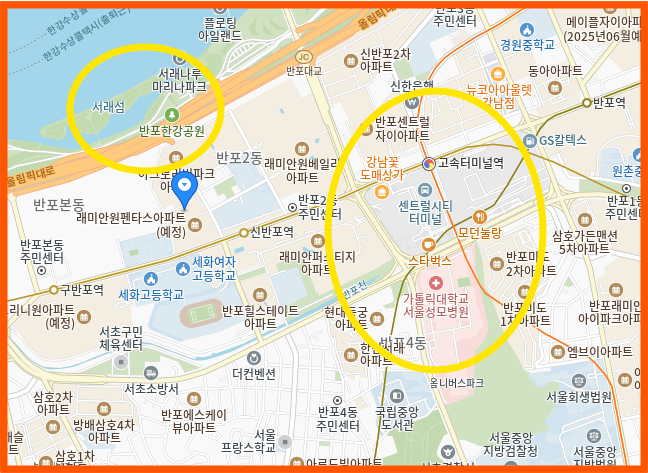 쇼핑과 의료시설도 잘 갖춰져 있어요. 신세계백화점과 강남성모병원이 도보로 이용 가능한 거리에 있어 생활 편의성이 뛰어나요. 여기에 한강을 마주한 반포한강공원이 600m 거리에 있어 여유로운 야외활동도 즐길 수 있어요.
