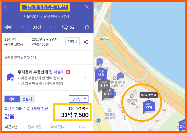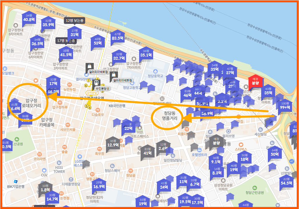 래미안 라클래시는 2021년 입주 아파트로 매매 호가가 35억 원 정도예요. 이렇게 주변 시세를 보면 청담 르엘의 분양가가 낮게 책정돼도 꽤 높은 시세차익을 기대할 수 있을 것 같아요.