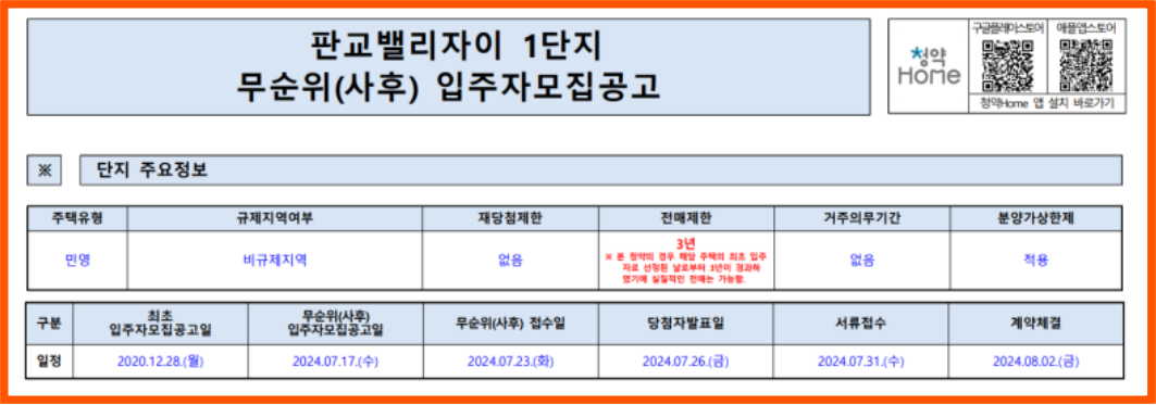 이번 판교밸리자이 1단지의 청약 일정은 2024년 7월 23일에 사후 청약 접수가 시작돼요. 당첨자 발표는 7월 26일, 계약일은 8월 2일로 예정돼 있답니다.
