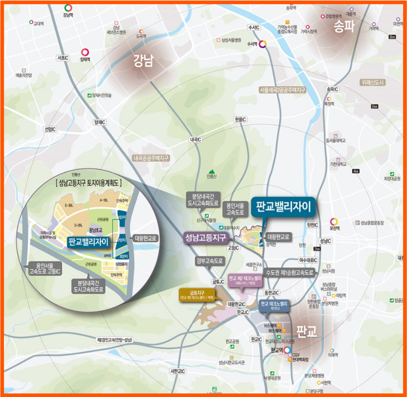 판교밸리자이 1단지는 판교테크노밸리 대형 개발사업의 배후 주거지로 주목받고 있는 상태에요. 뿐만 아니라, 용인-서울고속도로와 강남을 연결하는 다양한 광역버스와 시내버스를 이용하면 서울 강남 접근성이 매우 뛰어난다는 특징도 있죠.