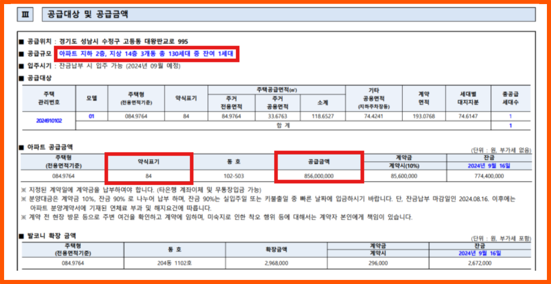 그리고 분양가는 84타입이 8억 5,600만 원이에요. 서울 강남 접근성도 좋고, 입지 조건도 뛰어난데 이 정도 가격이라면 정말 괜찮은 기회라고 할 수 있어요. 계약금은 10%로 8,560만 원, 나머지 잔금 90%는 입주 시에 납부하면 됩니다.