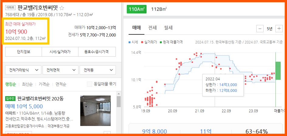 2023년에 사용승인을 받은 판교밸리호반써밋의 전용 84타입이 최근 10억 5,000만 원에 거래됐고,