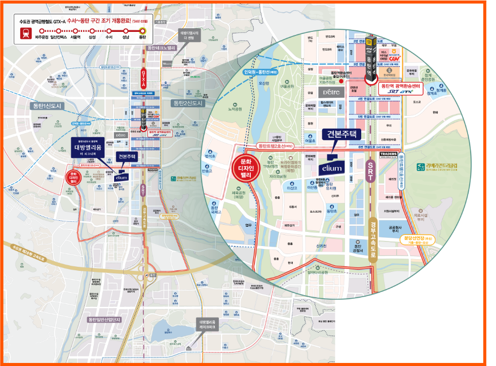 GTX-A 노선의 핵심지역인 동탄신도시에 위치해 있어서 교통이 아주 편리하답니다. 동탄역에서 성남역을 거쳐 수서역까지 20분이면 도착할 수 있어서 서울로의 접근성이 좋아요. 올해 연말에는 GTX-A 운정에서 서울, 교외선 대곡에서 의정부 구간이 개통될 예정이라서 수도권 출퇴근이 더욱 편리해질 거예요.