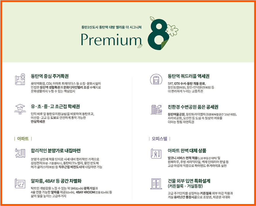 이 단지는 동탄2신도시의 중심에 자리하고 있어서 주거환경이 아주 우수합니다. 이외로도 다양한 장점들이 있는 화성 오산동에 위치한 동탄역 대방엘리움 더시그니처, 지금부터 자세히 알려드릴게요!