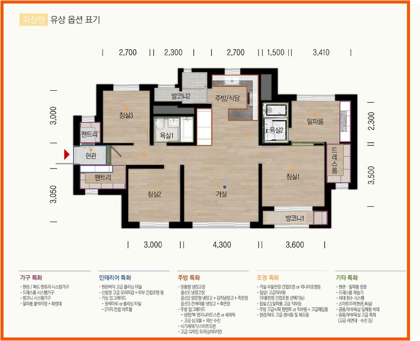 또한, 드레스룸과 팬트리 등 수납공간이 충분히 마련되어 있어서 공간 활용도가 높아요. 개인의 스타일에 맞춰 공간을 꾸밀 수 있는 장점이 있어요.