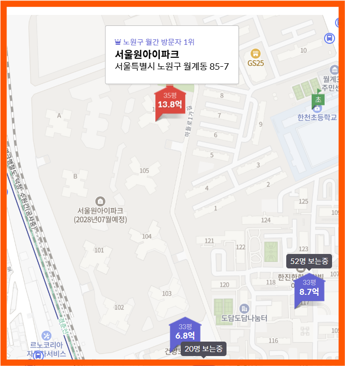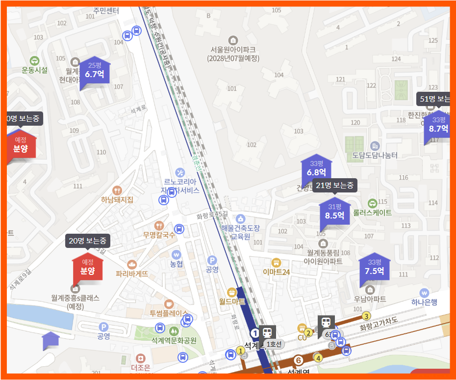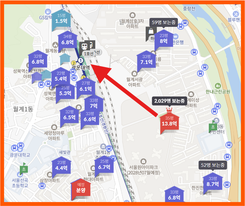먼저 입지를 이야기하지 않을 수 없죠. 월계동 서울원 아이파크는 노원구 월계동에 위치해 있고, 도보 8분 거리에 광운대역이 있어요.