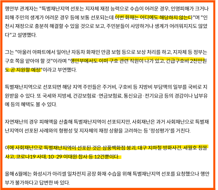 이번 화재로 인해 인천시는 정부에 특별재난지역 선포를 건의했어요. 특별재난지역으로 지정되면 해당 지역 주민들은 다양한 혜택을 받을 수 있어요. 주거비 지원부터 시작해서 국세, 지방세, 건강보험료, 연금보험료, 통신 요금, 전기 요금 등의 경감 혜택이 제공되죠. 특별재난지역 선포는 피해를 입은 주민들이 하루빨리 일상으로 복귀할 수 있도록 돕기 위한 조치랍니다.