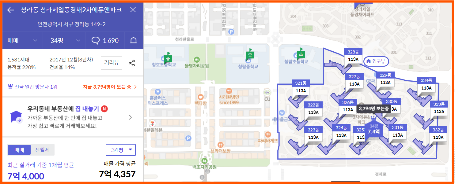인천 청라동에 위치한 청라제일풍경채2차에듀앤파크는 매매 기준 평균 약 7억원에 달하고 있어요. 어제, 오늘 호갱 노노에 실검 1위를 달성했는데, 생뚱맞게 올라와 있어 알아보니 화재사건이 발생했더라구요.