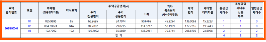 특별공급과 일반공급 세대의 동/호수 및 금액도 중요한 정보죠. 65 타입은 약 4.2억, 84 타입은 약 6억, 102 타입은 6.2억에서 6.4억 정도로 책정되었어요.
