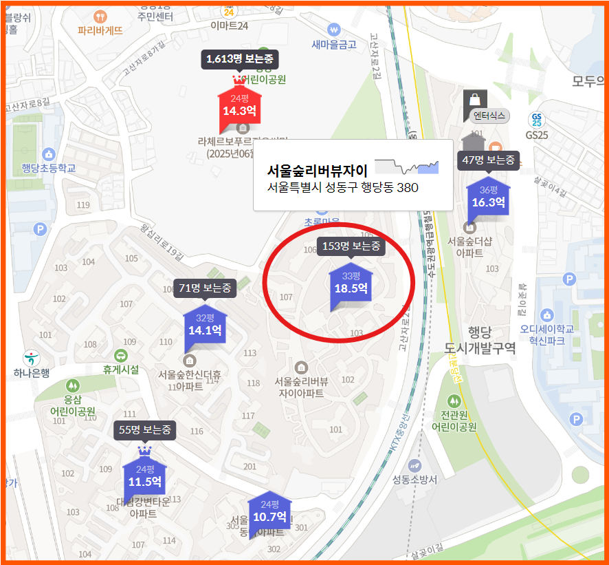 주변 시세와 비교해 보면, 바로 뒤에 위치한 서울숲 리버뷰 자이가 2018년 준공된 신축 아파트인데, 33평 기준 18.5억원으로 거래되고 있어요. 그렇다면 라체르보 푸르지오 써밋의 분양가와 비교했을 때 상대적으로 합리적인 금액이라는 생각이 들죠. 시세차익도 최소 3~4억 원 정도는 기대할 수 있을 것 같아요.