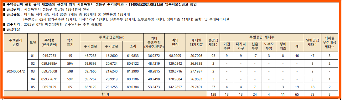 이번에 분양되는 라체르보 푸르지오 써밋은 최고 35층, 7개동, 총 958세대로 이루어진 대단지 아파트예요. 하지만 아쉽게도 일반 분양 물량은 138세대밖에 안 된다는 점이 조금 아쉽습니다. 그중에서도 전용 45㎡가 93세대로 가장 많이 나왔고, 나머지 59㎡와 65㎡도 조금씩 포함되어 있어요. 국민 평형이라고 할 수 있는 84㎡는 이번 분양에 포함되지 않았다는 점이 아쉽긴 하지만, 그래도 좋은 입지에 새 아파트를 분양받을 수 있다는 점에서 많은 분들이 관심을 가질 만한 프로젝트예요.