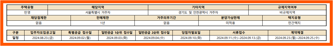 하지만, 만약 이 아파트에 청약을 넣으려면 청약 자격도 꼼꼼히 따져보시는 것이 좋아요.  예치기준금액도 서울 기준으로 85㎡ 이하는 300만 원, 102㎡ 이하는 600만 원, 135㎡ 이하는 1,000만 원, 135㎡ 초과는 1,500만 원을 납입해야 해요. 특히 이번 청약에서는 무주택자에게 우선권이 주어지기 때문에, 자격이 되는지 꼭 확인해보세요.