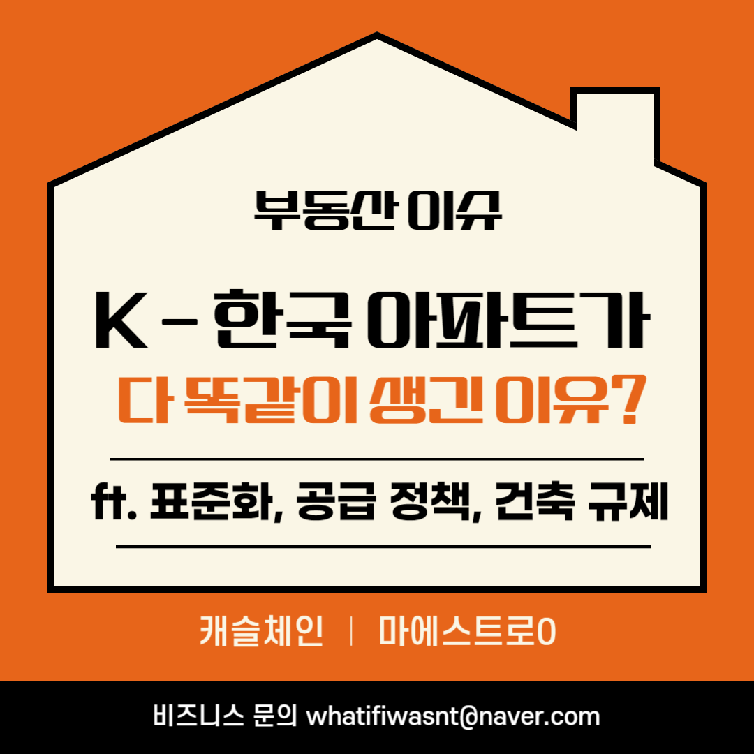 오늘은 K - 한국 아파트가 다 똑같이 생긴 이유(ft. 표준화, 공급 정책, 건축 규제)에 대해 다뤄보려고 합니다. 한국의 아파트가 유사한 디자인과 형태를 가지게 된 배경에는 건축 효율성, 경제성, 정부 정책, 시장의 요구 등이 복합적으로 작용한 결과인데요. 그럼 자세히 알아보도록 하겠습니다.